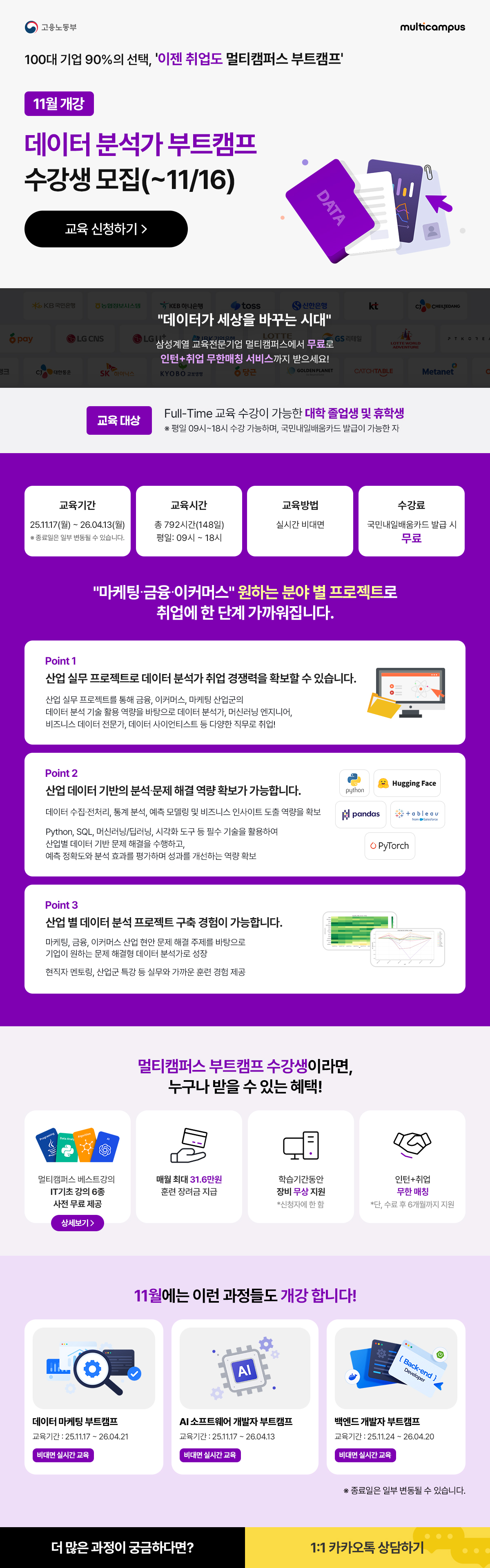 제목 [멀티캠퍼스] 11월 데이터 분석가 부트캠프 교육과정 수강생 모집안내 (~11/16)