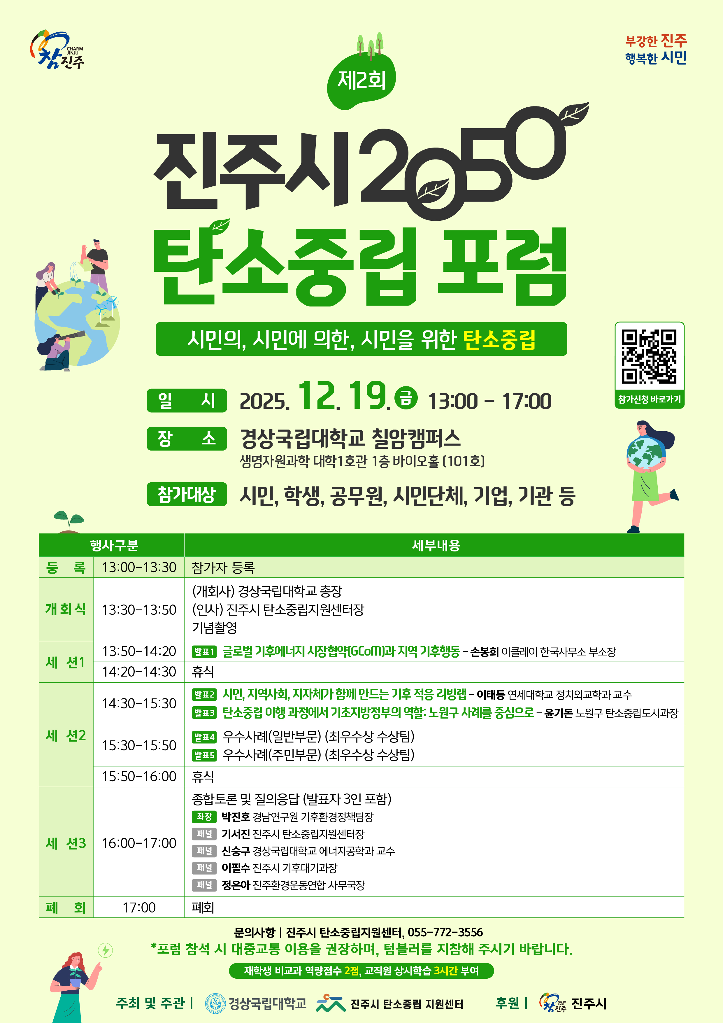 진주시 탄소중립지원센터에서는 진주시 2050 탄소중립 실현을 위한 미래세대 참여 확대와 시민 역량 강화를 위해 「 제2회 진주시 2050 탄소중립 포럼」을 개최하고자 합니다. 이번 포럼은 단순한 정책 전달을 넘어 인식·참여·실천이 선순환하는 시민 중심의 탄소중립 전환체계를 구축하기 위한 논의의 장으로 마련되었으니, 교직원 및 학생 여러분의 많은 관심과 참여를 부탁드립니다.