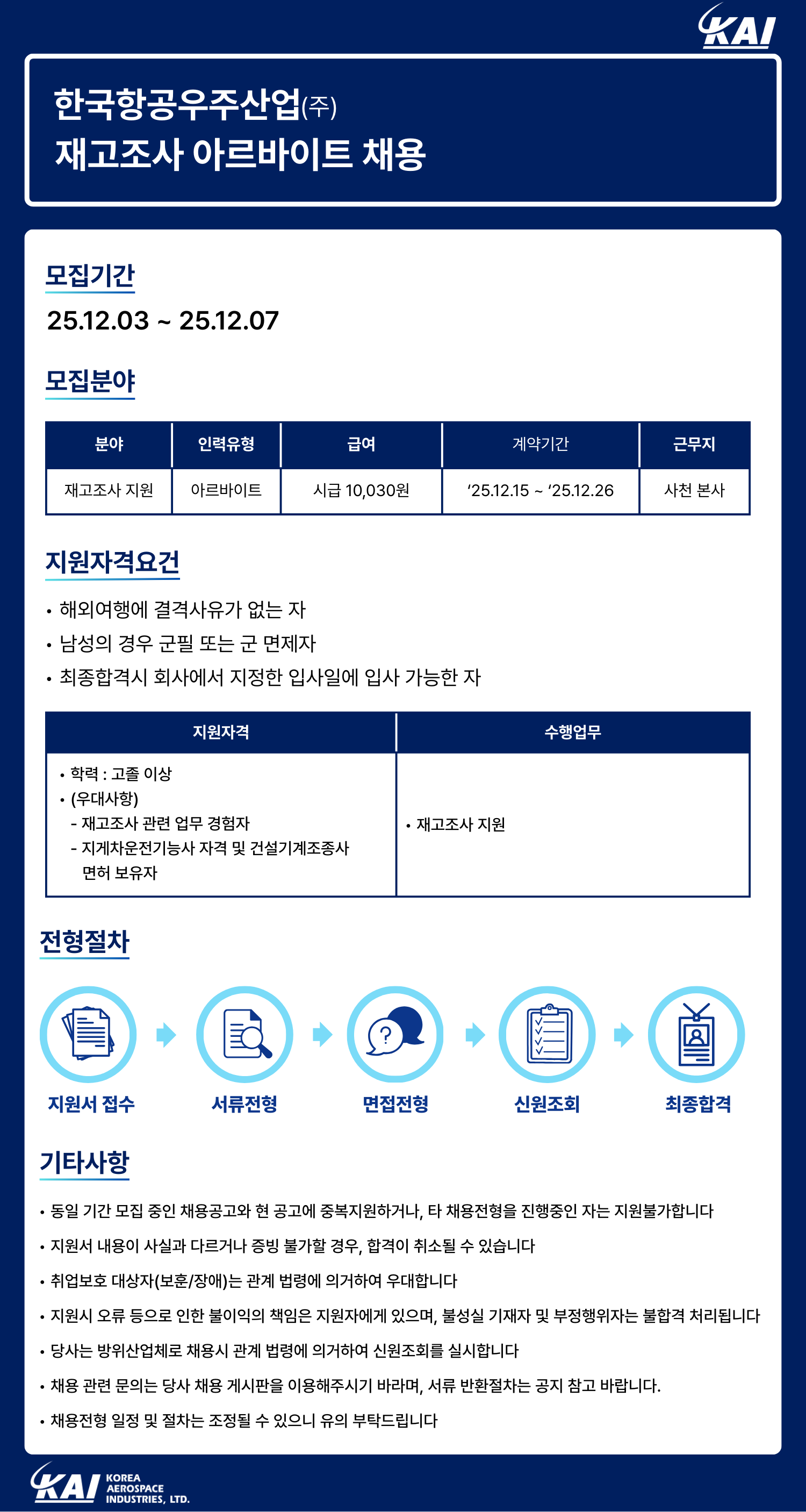 제목 [KAI] 재고조사 아르바이트 채용 (12/9일까지 연장)