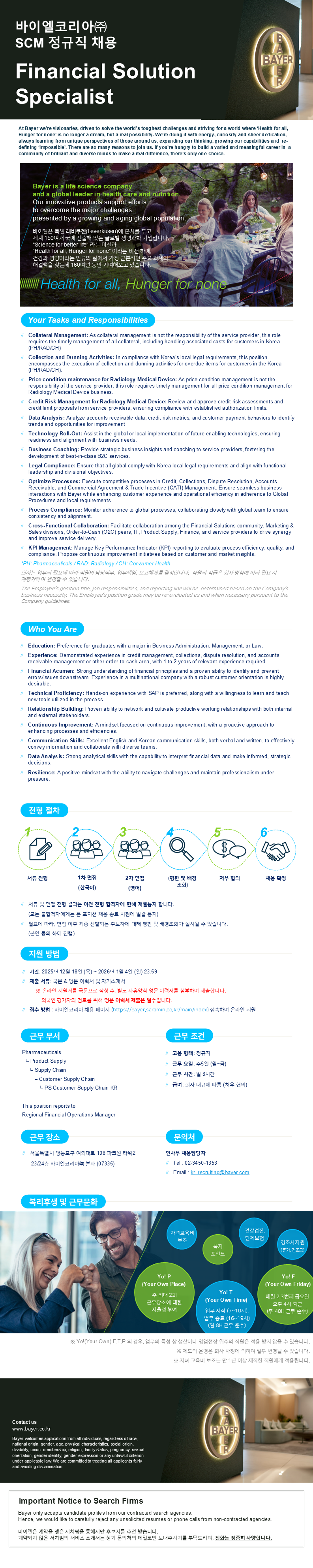 - 모집 명: [바이엘코리아] Financial Solution Specialist (SCM 정규직)