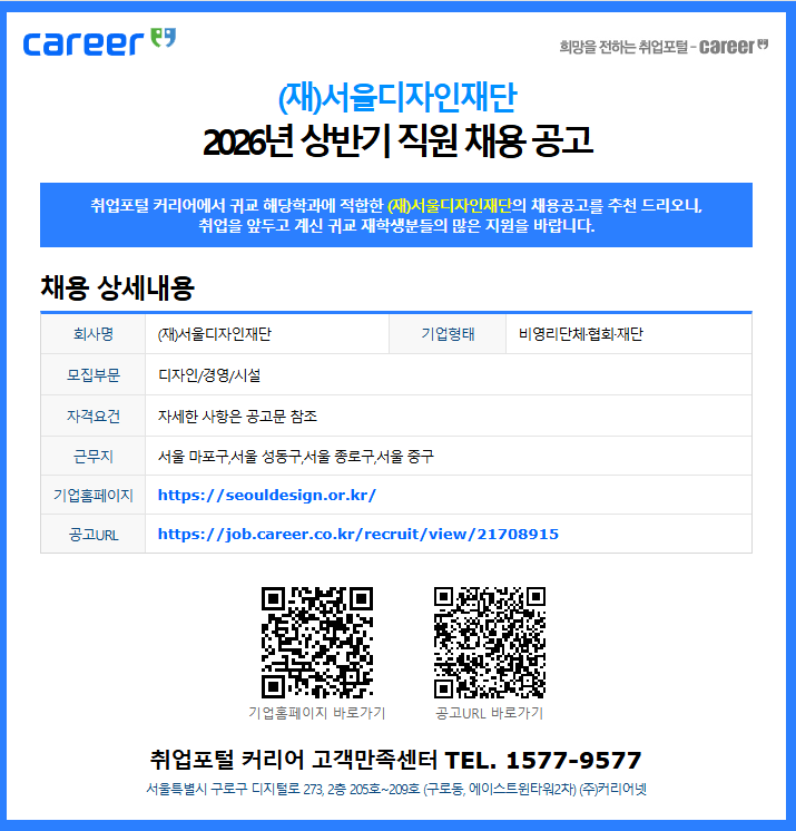 [커리어] 2026년 상반기 서울디자인재단 직원 채용 공고(~2/24) |