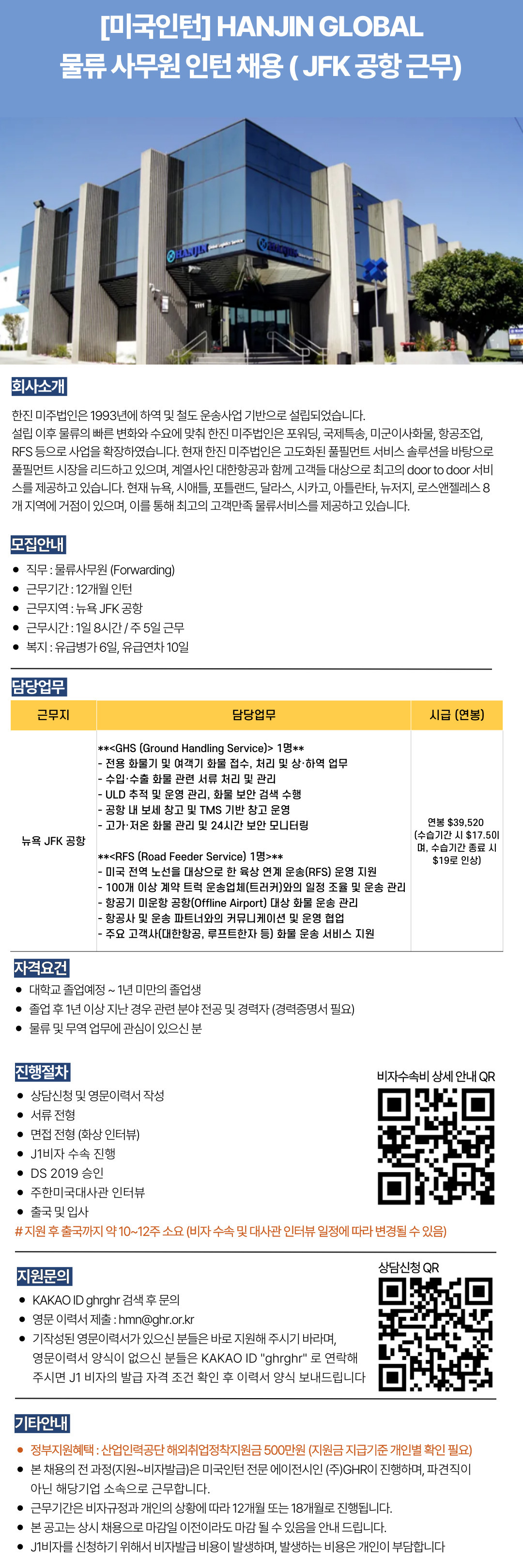 [미국인턴]HANJIN GLOBAL 물류 사무원 인턴 채용 (JFK 공항 근무) (~01/11) |